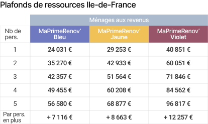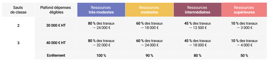 Cette aide versée par l'Agence nationale de l'habitat (Anah), est calculée en fonction des revenus des ménages catégorisés en 4 profils de couleur, allant des ménages les plus modestes aux ménages les plus aisés, ainsi que du gain écologique permis par les travaux.