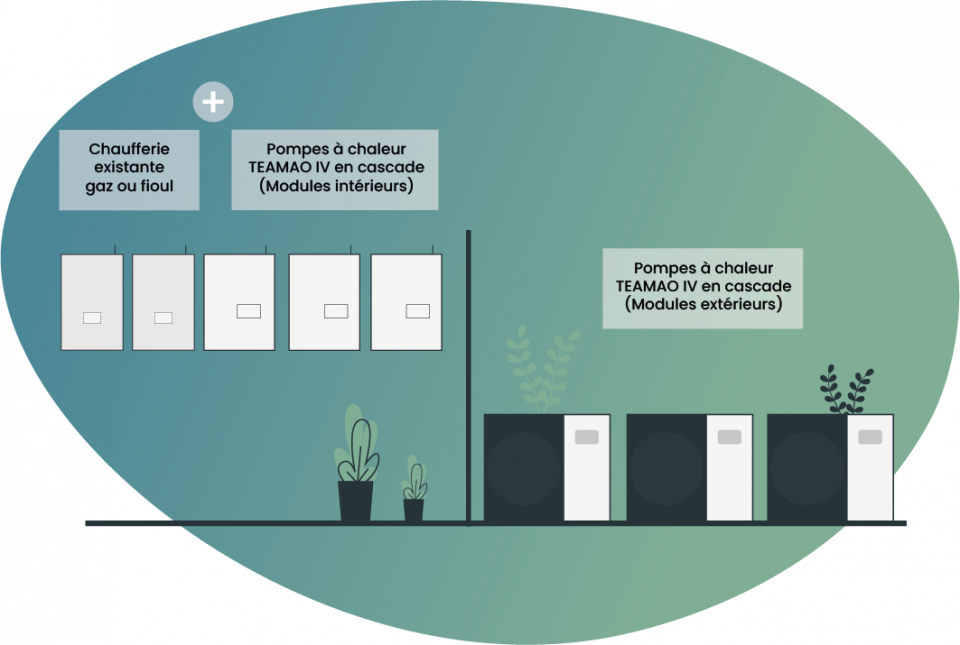 Même lorsque les bâtiments conservent leur chaufferie gaz actuelles, il est aujourd’hui possible d’améliorer davantage leurs performances énergétiques en y associant des pompes à chaleur (PAC).
